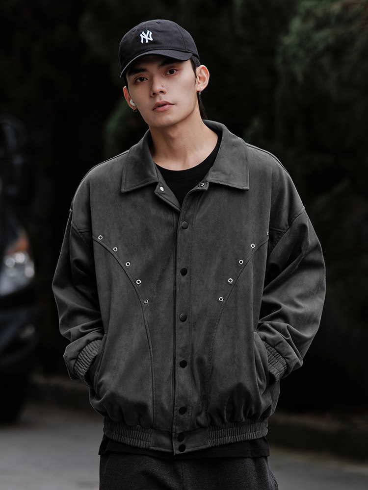 RETROMIND 美式高街风深灰色麂皮绒夹克纽钉设计宽松保暖外套男热门设计联盟服务商